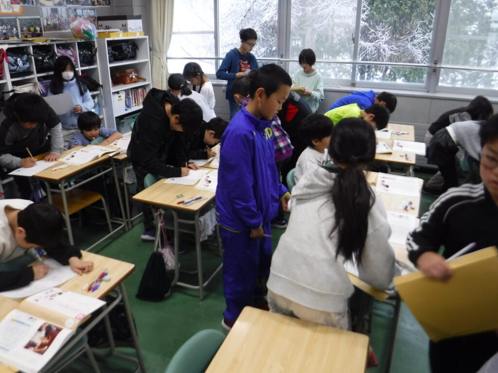 冬の言葉探しに挑戦しました。「冬といえば」から連想する言葉を次々とつなげ、2年生は10個以上の言葉を書き出しました。その後の交流の時間では、「ああ、なるほど!」と友達の意見にうなずきながら聞き入る子どもたちの姿が大変印象的でした。言葉の連想から、豊かな季節の発見があったようです。
