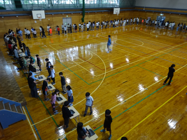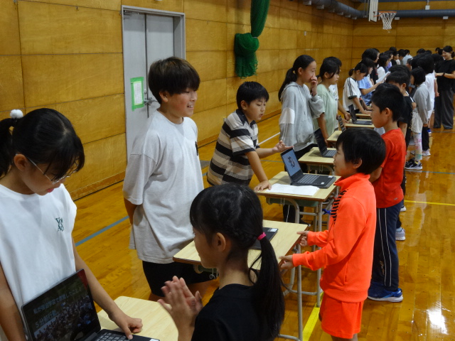 5年生が宿泊学習で楽しかったこと、学んだことを4年生に発表しました。一人1台ずつタブレットを準備し、事前に作成したスライドをもとに宿泊学習の楽しかったことベスト3や、学んだことなどを4年生に伝えていました。楽しかったことは一人ひとり異なっていましたが、学んだこと・大事なことは多くの児童が「時間を守ること」を挙げていました。4年生にとって、来年の宿泊学習が楽しみになる学習でした。