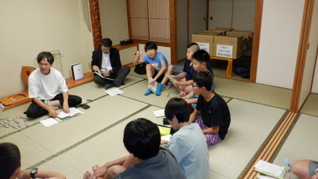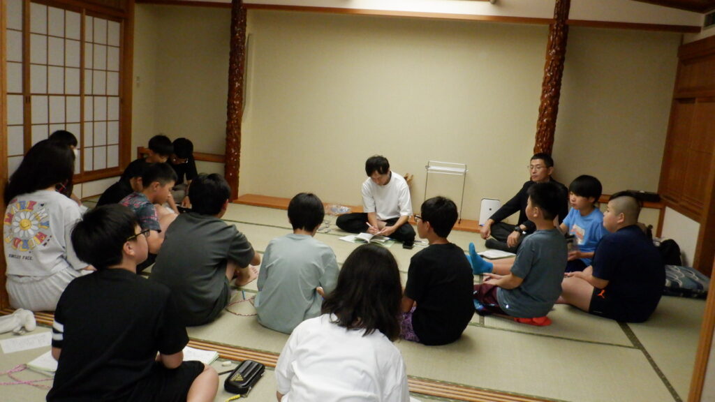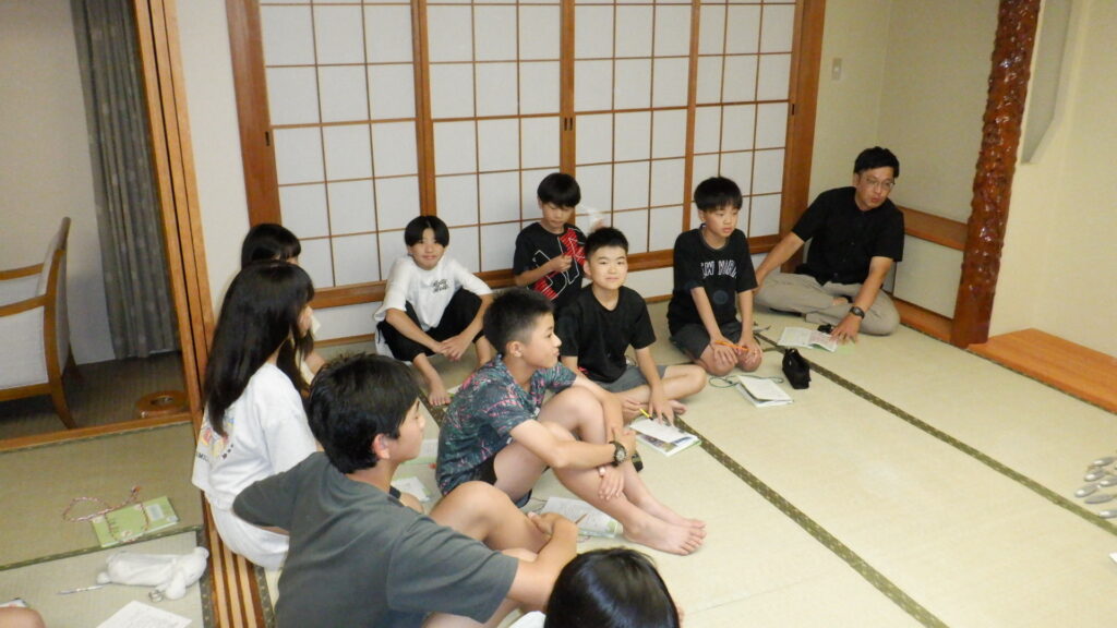 1日の振り返り。室長たちが集まり、緊張感をもって先生方の話を聞いています。部屋にもどり、みんなに確認事項を伝えることもしっかりできました。