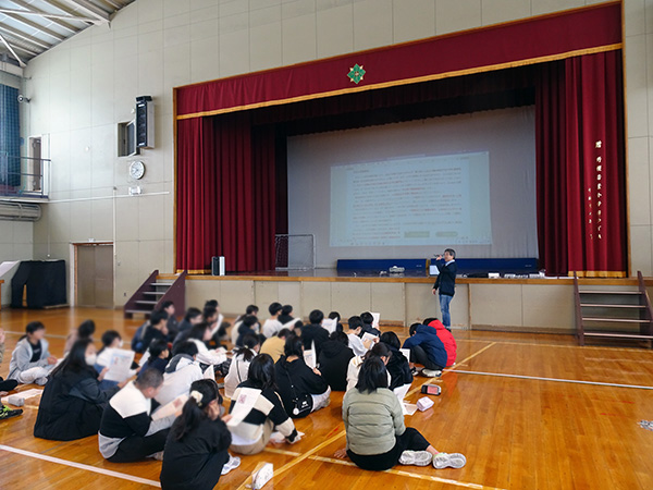 今回は、レバンガ北海道の折茂武彦さんをお招きし、ご自身の経験をもとに講話をしていただきました。お話の中では、「当たり前のことを当たり前に行う大切さ」「努力を続けること」「あきらめない心」「他者との関わり」「夢や希望をもつこと」「挫折から学ぶこと」など、自信の経験から子どもたちの心に響く言葉がたくさん語られました。