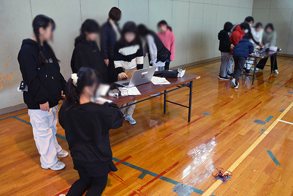 学習では、ドローンの動きをプログラミングし、指定された位置まで移動させてクリップを集める活動に取り組みました。児童たちは、思い通りに動かすためにはどのような指示が必要かを考えながら、試行錯誤を重ねていました。