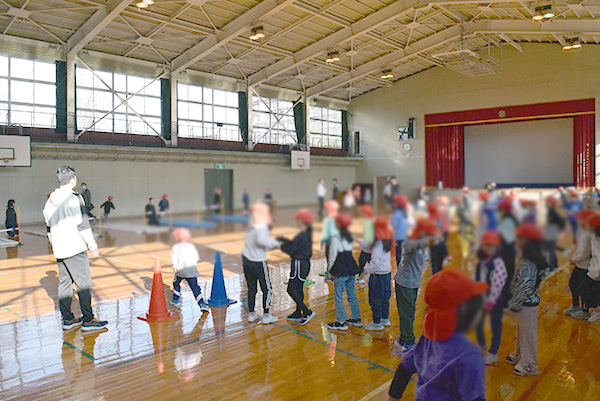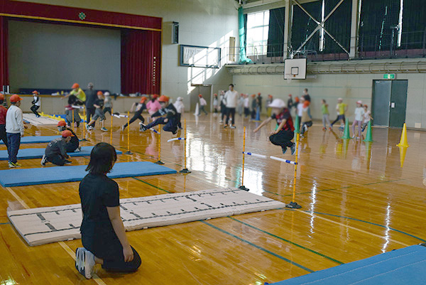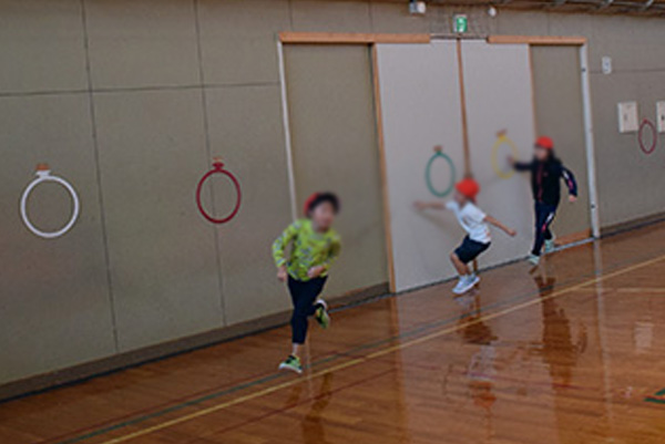 授業では、持久力を高める運動を中心に、さまざまな器具を使って体を動かしました。子どもたちは飛んだり跳ねたり、思いきり走ったりと、終始楽しそうな表情。大学の先生のお手本を見ながら、意欲的に取り組む姿が見られました。