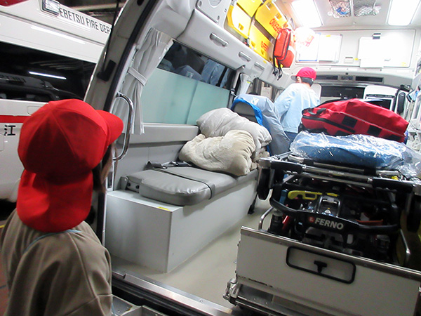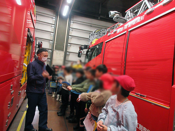 消防署では、消防車や救急車を間近で見ることができ、大きな車や装備に驚いたり、興味深そうに質問したりする姿が見られました。災害現場でどのように救助を行うのか、消防士さんから丁寧に教えていただき、命を守る仕事の大切さについてもしっかり学ぶことができました。