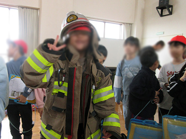 また、防火服を着る体験もさせていただきました。実際に身につけてみると想像以上に重く、消防士さんの仕事の大変さを実感していたようです。