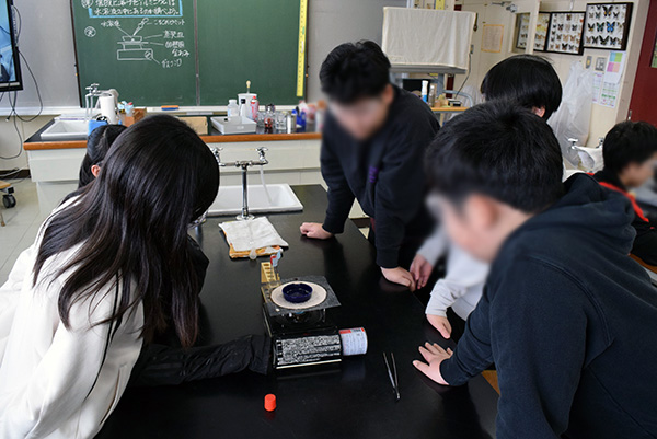 今回はさらに学習を深めるため、金属が溶けた後の液を蒸発皿に取り、加熱して水分を飛ばす実験を行いました。